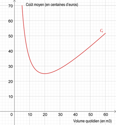Le coût moyen d'une production de 50 m3 est de 4 300 € (penser que \(x\) est exprimé en centaine d'euros).
