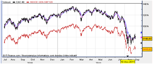 On remarque cependant que les évolutions sont souvent très proches selon que les indices sont larges ou au contraire plus sélectifs. Le graphique ci-dessous compare les mouvements du CAC 40 et du SBF 120 (respectivement 40 et 120 valeurs). Ils sont à peu près identiques (source Boursorama).