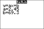 Nous sommes d’accord avec ce qui est proposé : la liste 1 représente bien les valeurs des \(x_i\) et L2 est bien celle des \(y_i.\) Donc, touche entrer plusieurs fois pour valider. Rappelons que \(a\) est le coefficient directeur et \(b\) est l'ordonnée à l'origine. L’équation cherchée est \(y = 2,45x + 69,3.\)
