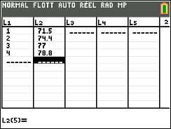 Précipitez-vous sur la touche stats de la calculatrice puis optez pour le choix 1 du menu d’édition (Modifier…). Entrez les \(x_i\) en L1 et les \(y_i\) en L2.