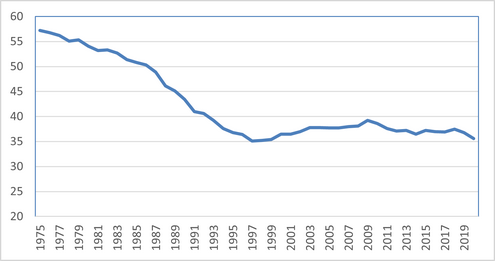 À titre d’illustration, le graphique ci-dessous montre l’évolution du taux d’activité en France (moyenne annuelle) pour la tranche 15-24 ans. Elle doit être mise en parallèle avec l’allongement de la durée des études. Source INSEE.