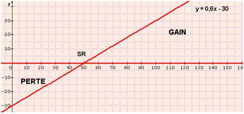 On peut préférer une formule générale. Il faut que la fonction de résultat soit égale à zéro. Ici, il s’agit d’une fonction affine mais il est possible d’utiliser d’autres types de fonctions. En pratique, on considère généralement une approximation affine sur un intervalle donné d'une fonction dont la représentation est globalement une courbe. La MCV étant de \(60\%,\) on a \(f(x)\) \(=\) \(0,6x - 30\) \(=\) \(0,\) donc \(x = 50\) € (illustration du quotient ci-dessus). La marge de sécurité s’élève elle aussi à 50 €.