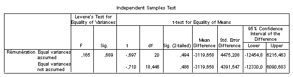 Un exemple : peut-on considérer que la moyenne des rémunérations dans les deux services suivants est identique ? Hypothèse 0 : elles sont identiques, avec un risque d'erreur de \(5\%.\) Hypothèse 1 : elles sont différentes.