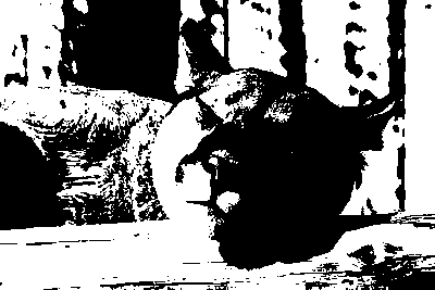 En page de profondeur de couleur vous trouverez une photo de puma en niveaux de gris et cette même image retraitée avec un seuil de \(50\%.\) Réalisée à partir d'une photo de meilleure qualité que ci-dessous, vous pourrez remarquer que l'image binaire montre des détails plus fins.