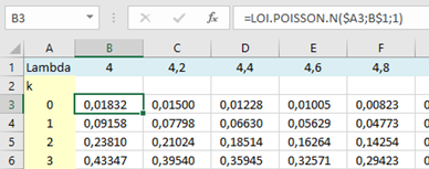 Après avoir rempli la ligne des valeurs de \(λ\) et la colonne des valeurs de \(k,\) positionnez-vous sur la première cellule de la table (ici B3) et renseignez la fenêtre qui s'affiche lorsque vous sélectionnez la loi de Poisson dans les fonctions statistiques. Soit la valeur \(k\) de la variable aléatoire \(X,\) puis l’espérance \(λ,\) puis 0 puisque pour l'instant nous construisons une table de probabilités non cumulées.