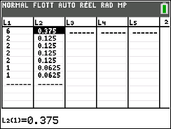 Là, vous devrez écrire List 1 / 16 ou mieux, List 1 divisé par la somme de List 1 (ce qui nous évite de la calculer). Pour faire apparaître List, il faut appuyer sur la touche OPTN. Le menu du bas change.