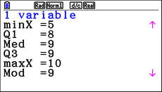 Entrez les valeurs de la série en List 1 et les effectifs correspondants en List 2. Choix CALC (touche F2).