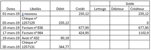 Nous payons 235,12 € au fournisseur en règlement d’une dette qui date d’avant mars. On lui attribue la lettre A. Facile. Ensuite, c’est plus subtil ! Il faut remarquer que notre chèque de 344,77 € correspond à la facture de 424,95 € de laquelle on a retranché l’avoir de 80,18 €. Donc on attribue la lettre B à ces trois lignes. Il nous reste la facture de 677,95 €, que nous n’avons pas réglée. C’est ce montant qui figure en solde créditeur à la fin du mois :