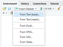 L’importation avec R-Studio se déroule très simplement. Dans la fenêtre Environment (en haut à droite), clic sur le bouton Import Dataset et un menu propose un choix de formats.
